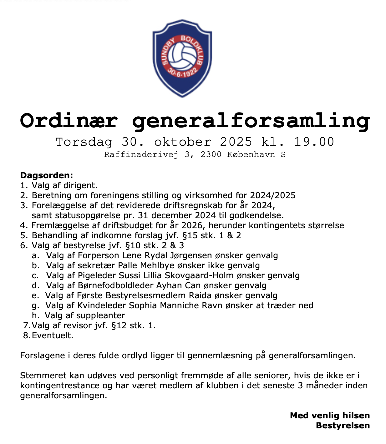 Indkaldelse til Generalforsamling 30. Oktober 2025 kl 19:00