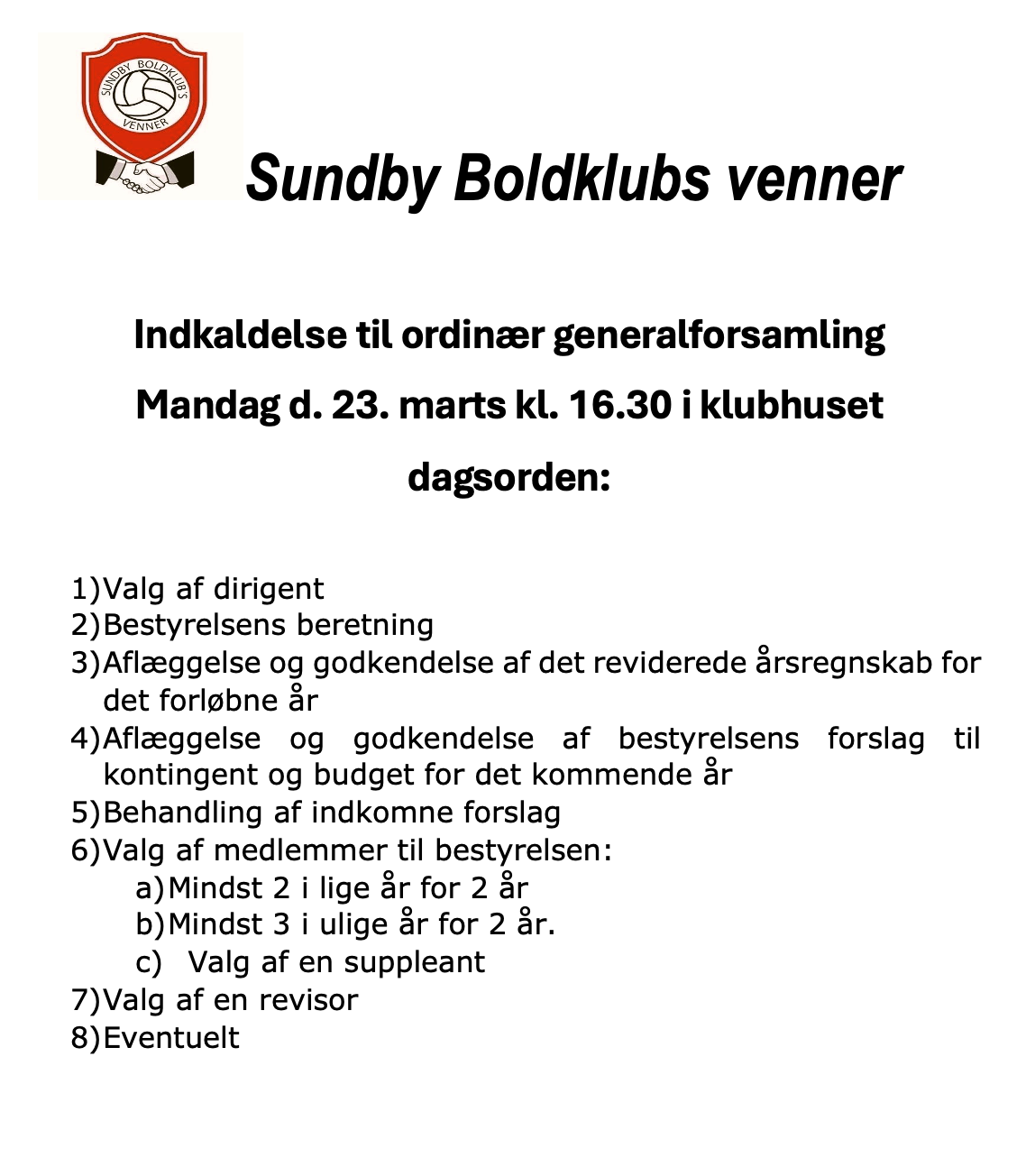 Indkaldelse til ordinær generalforsamling i Sundby Boldklubs Venner
